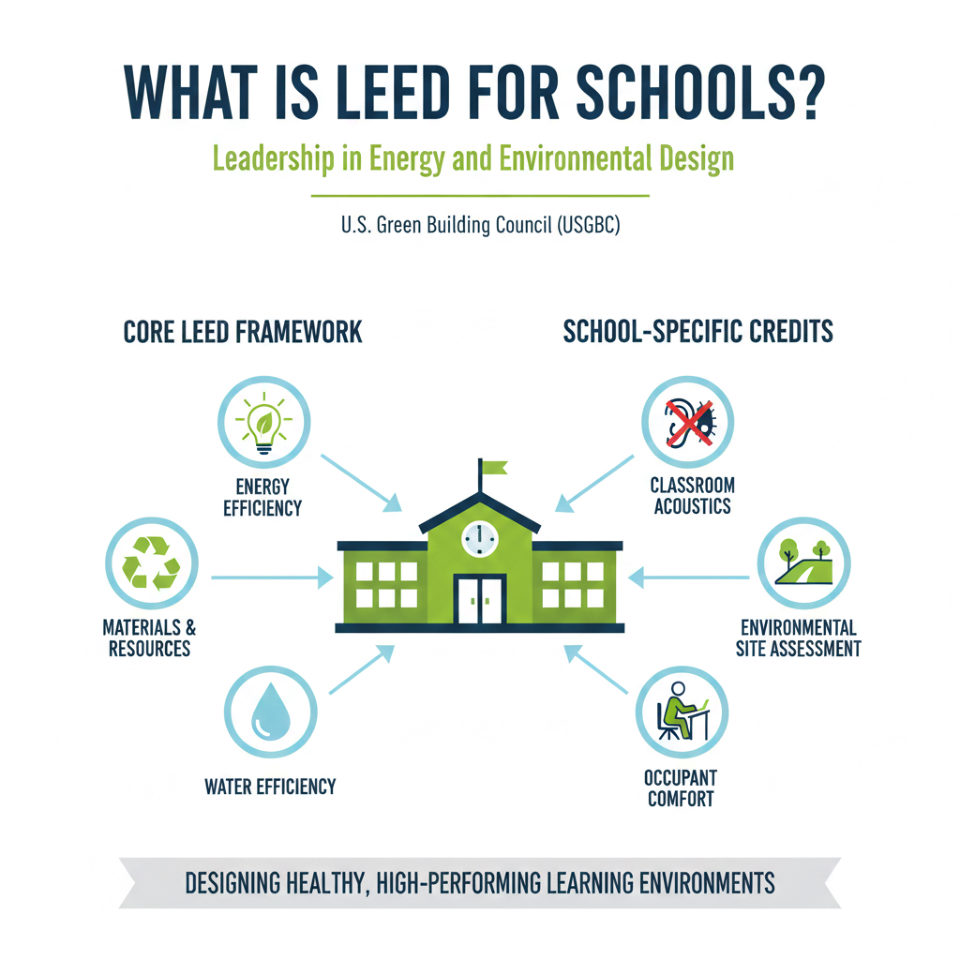 LEED (Leadership in Energy and Environmental Design) for Schools is a specialized rating system developed by the U.S. Green Building Council (USGBC) to address the unique needs of educational facilities. It builds on the core LEED framework while adding credits specific to classroom acoustics, mold prevention, environmental site assessment, and occupant comfort - all critical factors in learning environments.